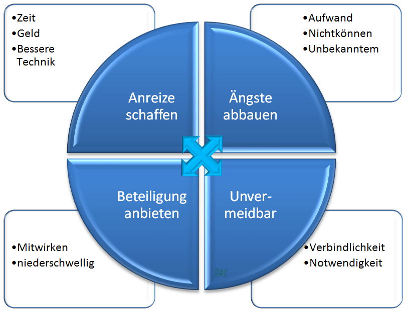 Gelingensbedingungen zur Initiierung einer Abstimmung im Kollegium [CC By Sa]Veränderungsmanagement könnte DIE Herausforderung der Implementierung digitaler Bildung in Schulen sein. Ein Indiez hierfür ist eine Gruppe von Lehrern innerhalb eines jeden Kollegiums, die der Entwicklung skeptisch, zögerlich und teilweise verwiegernd gegenüber stehen.