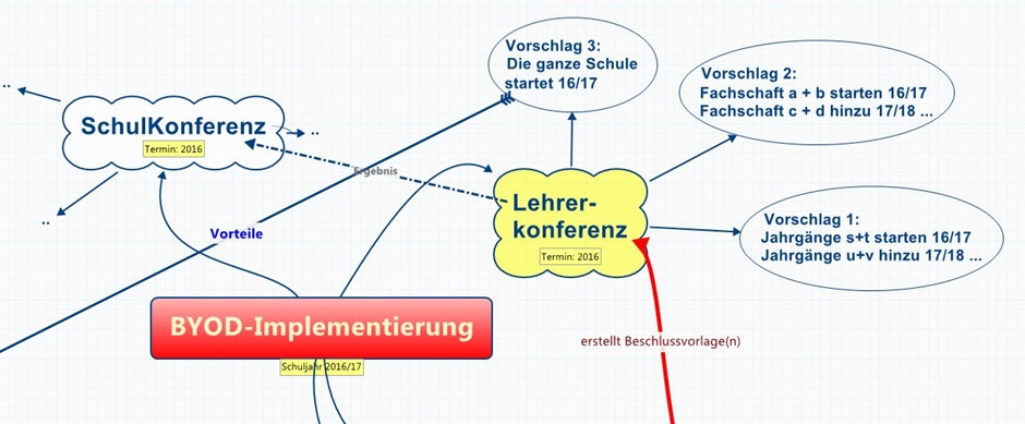 - niederschwellig: Erste Abstimmung betrifft den einzelnen Lehrer noch nicht persönlich - er stimmt nur dafür, dass eine Arbeitsgruppe einen Projektplan erstellt. Der erstellte Projektplan muss später von der Lehrerkonferenz dann genehmigt werden.