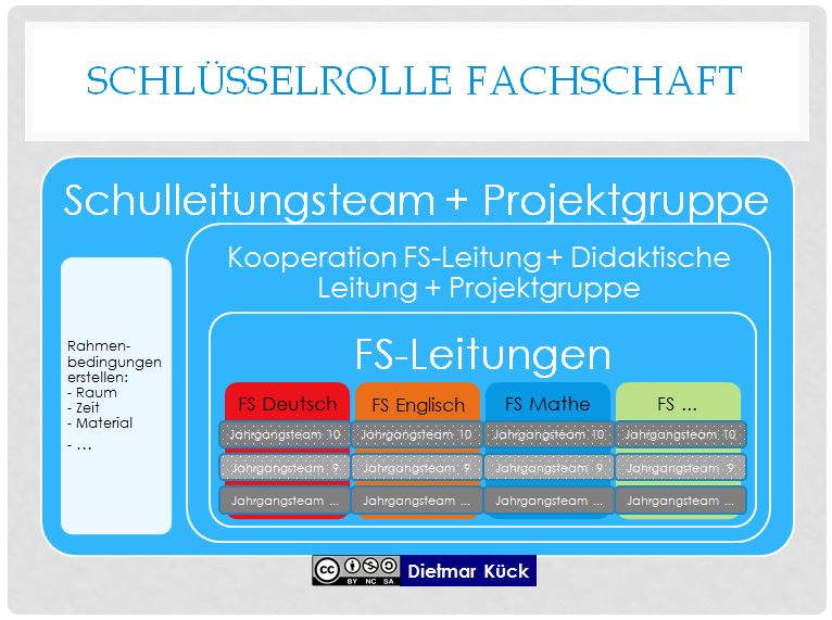 In der Fachschaft findet Unterrichtsentwicklung statt. Da die Implementierung von Smartphones im Unterricht korreliert mit der Veränderung von Unterricht, übernehmen die Fachschaften der Schule zum Teil die inhaltliche Ausgestaltung des systematischen Smartphone-Einsatzes im Unterricht des jeweiligen Unterrichtsfaches.