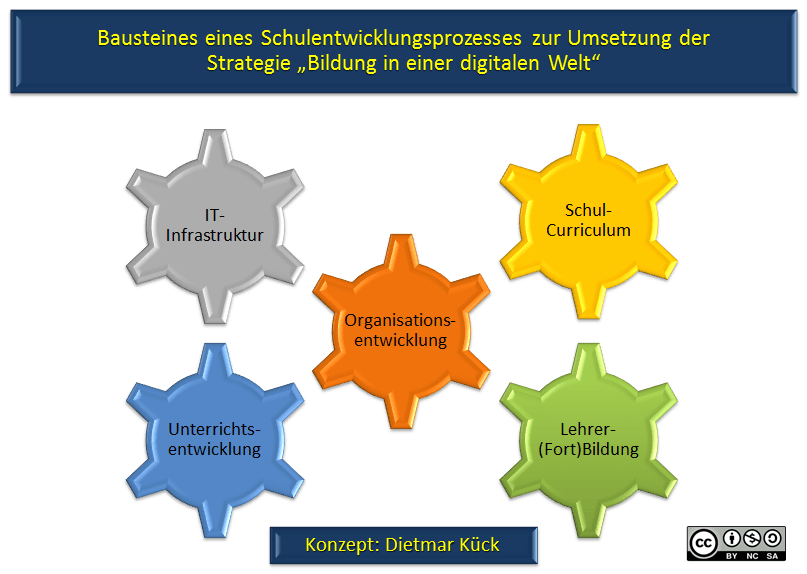 Aus einer Vielzahl von Beratungsgesprächen mit Akteuren aus Schulen, Schulträgern und Schulbehörden aus verschiedenen Bundesländern in ganz Deutschland kristallisieren sich fünf Bausteine für gelingende Schulentwicklung einer Digital-Strategie heraus, die wie Stellschrauben wirken: