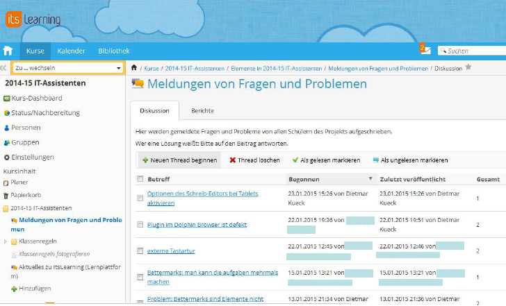 Bei jedem Auftreten eines Problems sind Schüler und Lehrer gehalten, erst im Forum nach einer Lösung zu suchen. Wenn keine Lösung vorhanden ist, wird eine neue Anfrage gestellt.